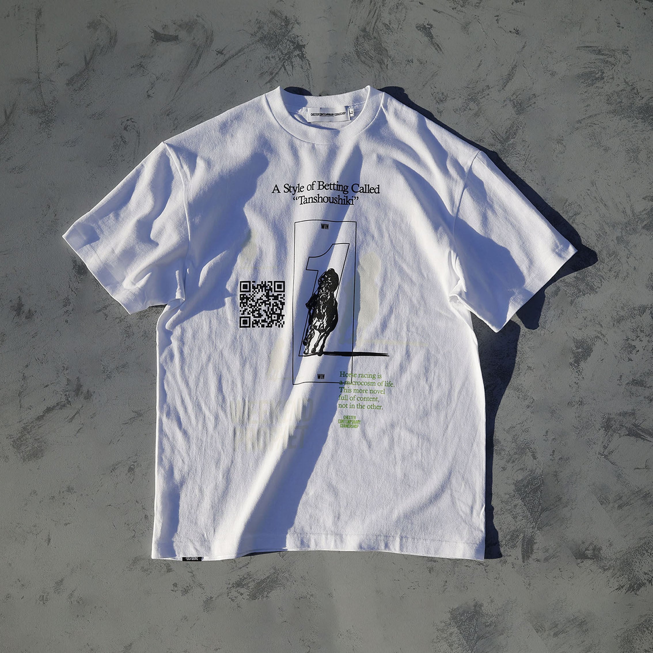 馬券から着想を得たグラフィック、レースの行方に集中するあまり「見えないものも見えてしまった」かのよう残像をヴィンテージリメイクTEEのような重ねで表現したbody同色のプリント。