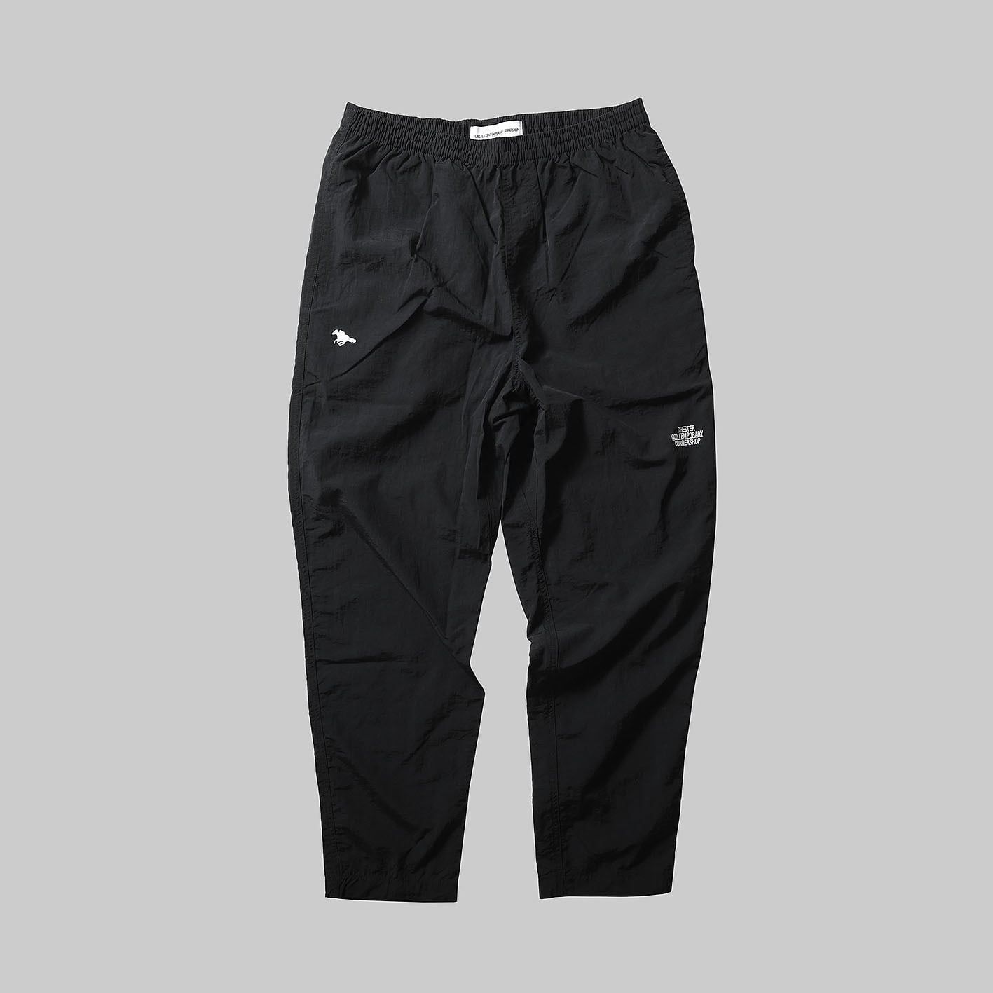 ショートパンツ同様に撥水加工された軽い素材、ゆとりのあるワタリ、膝下から裾へかけての絶妙なテーパードがリラックスとシャープさを兼ね備えた大人なジョガーパンツ。