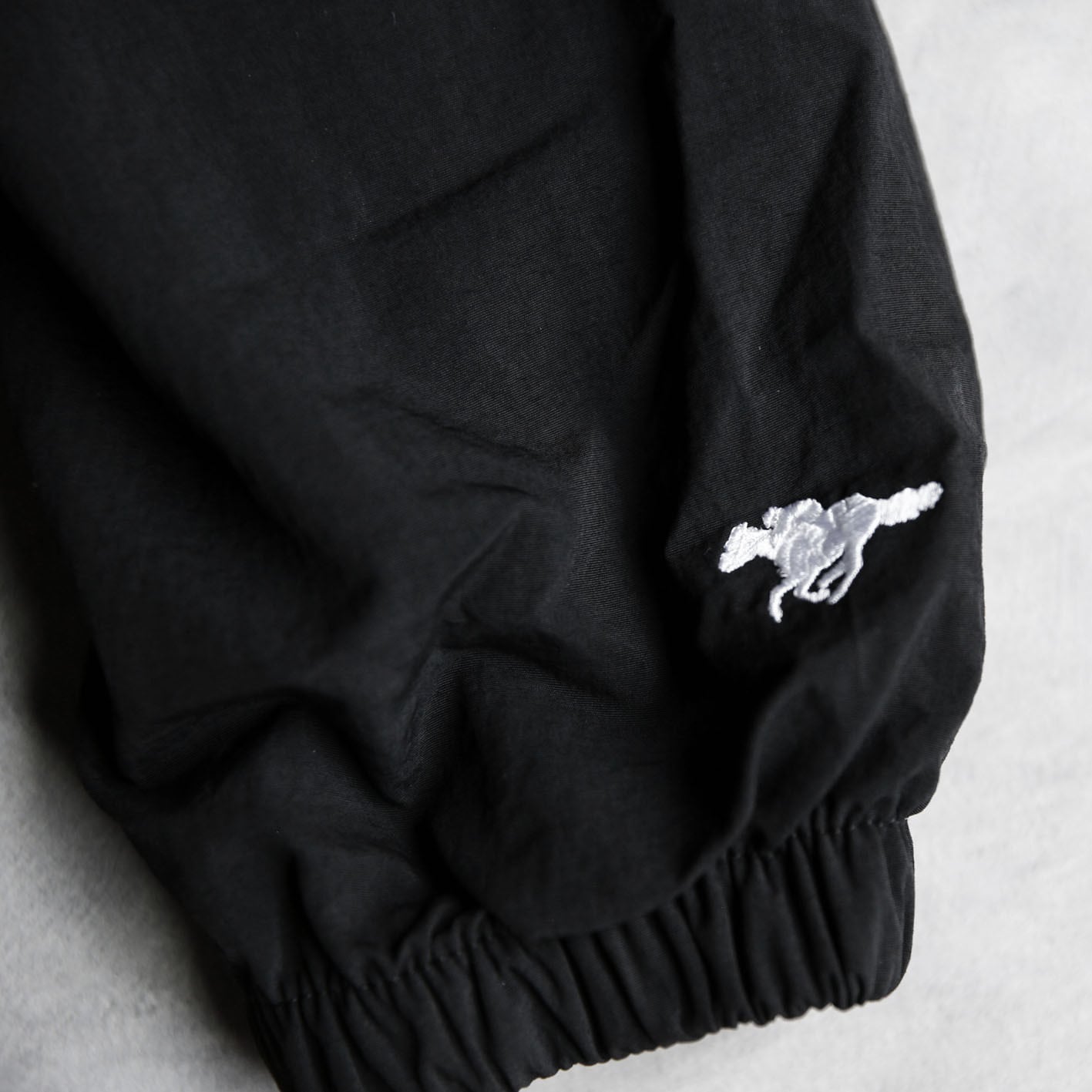 CHESTER CONTEMPORARY CORNERSHOPチームジャケット的なデザインが魅力のナイロンブルゾン。三冠(牡馬)を彷彿とさせるワード、各所に刺繍とプリントで散りばめられたロゴ、90s的なスタンドカラーのボックスシルエットとワッシャー加工によるコットンライクな質感など、競馬を感じさせる内容が人気のレトロスポーツに落とし込まれたデザインはデイリー、リラックスからスポーツまでシーンを選ばず軽快にお楽しみいただけます。現地でのちょっとした冷え込みにサラッと羽織れる着回しの良さも見逃せません。同素材のナイロンパンツとのセットアップもおすすめです。