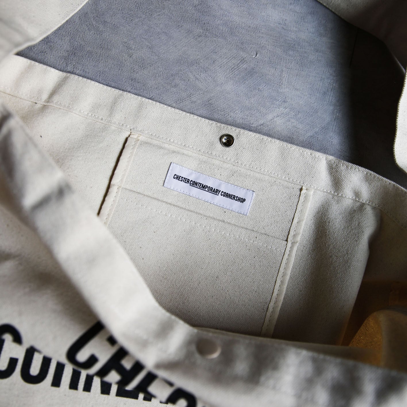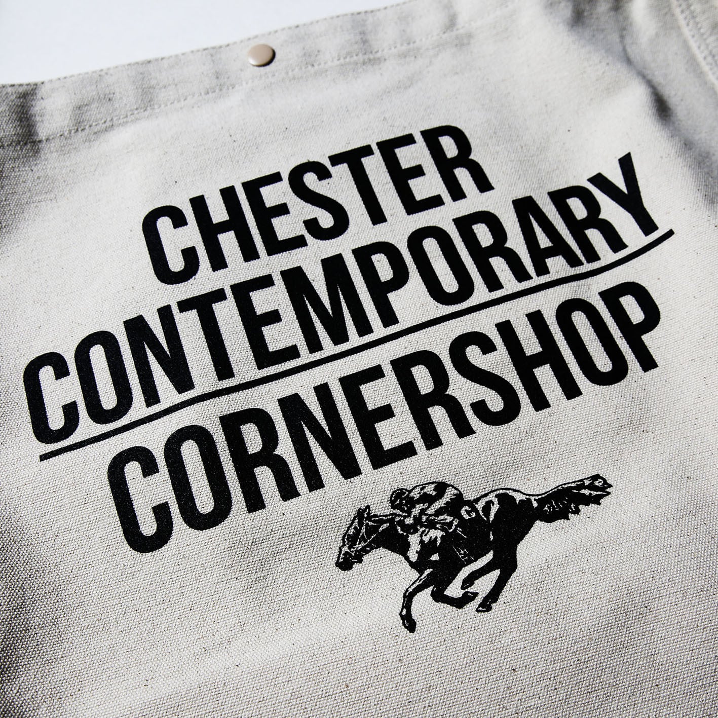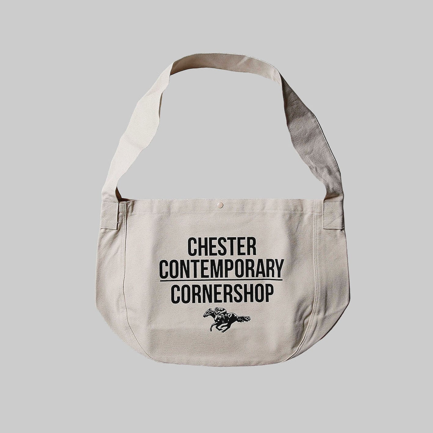 CHESTER CONTEMPORARY CORNERSHOPベーシックロゴがプリントされたニュースペーパーバッグスタイルのショルダーバッグです。太めのショルダー、体に馴染むシルエット、内容物が見つけやすい内ポケット付き仕様は競馬場、場外にも最適な使い勝手。伝統と疾走感を感じる一点。袋口にはドットボタン付き。