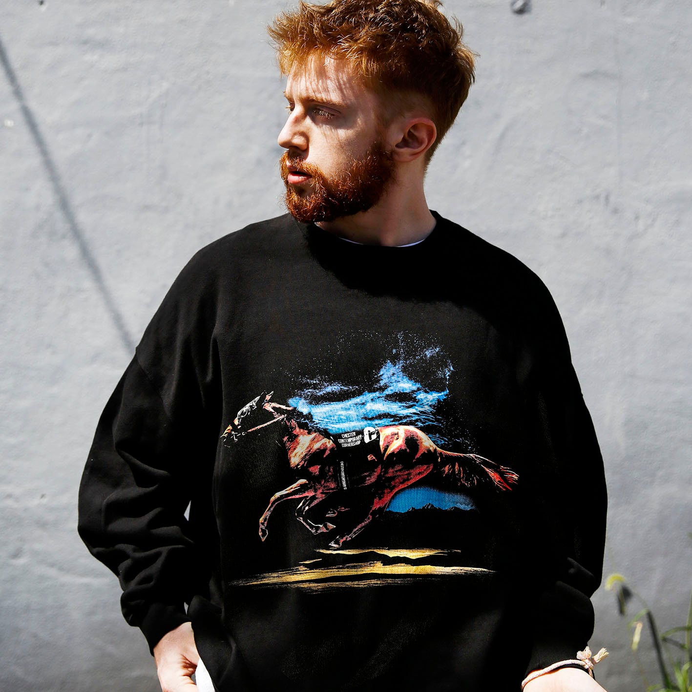 夜を駆け抜ける勇姿を浸透性のあるプリント技法でヴィンテージライクに仕上げたリッチなデザインはチェスターならではの圧倒的な一枚です。